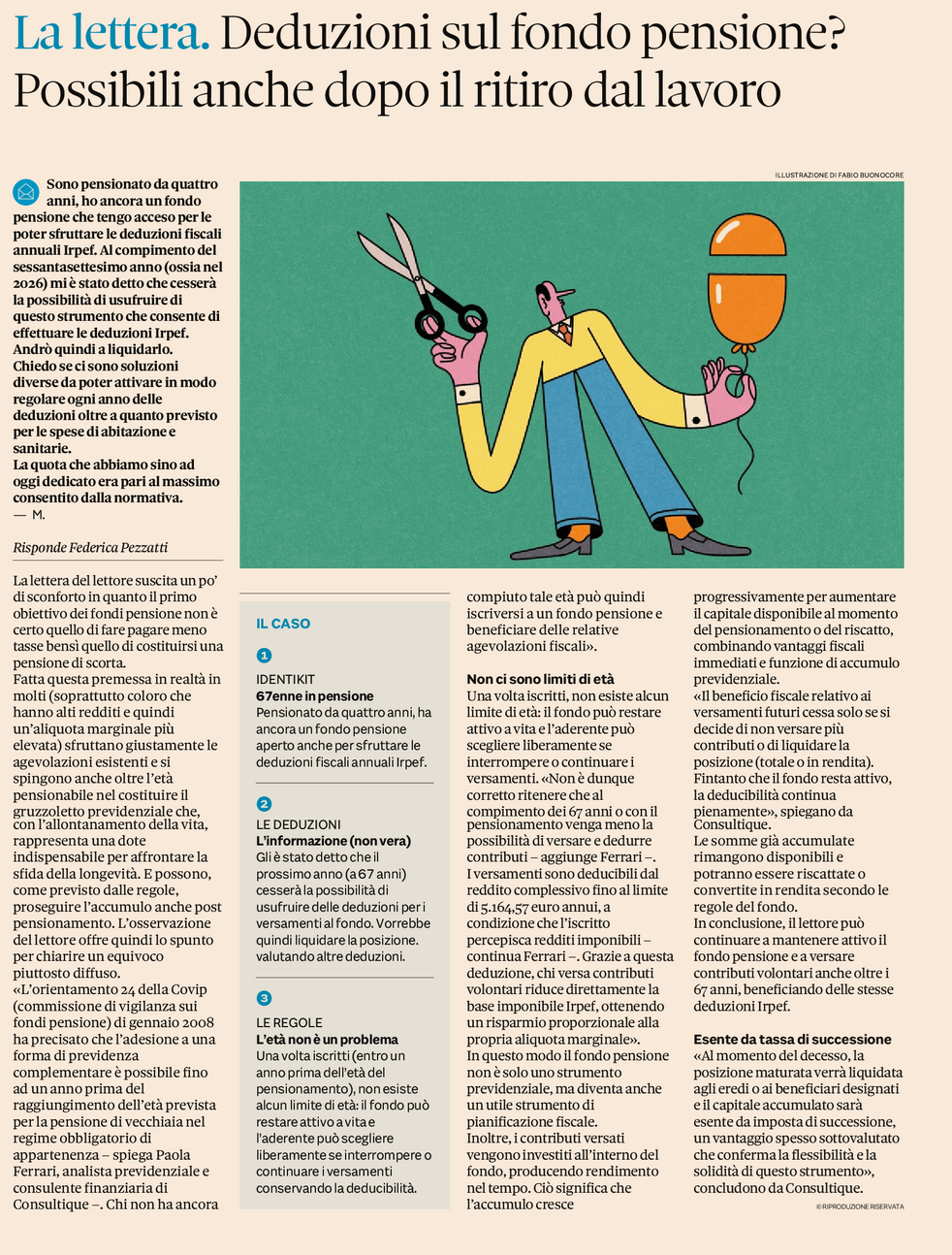 In conclusione, il lettore può continuare a mantenere attivo il fondo pensione e a versare contributi volontari anche oltre i 67 anni, beneficiando delle stesse deduzioni Irpef.