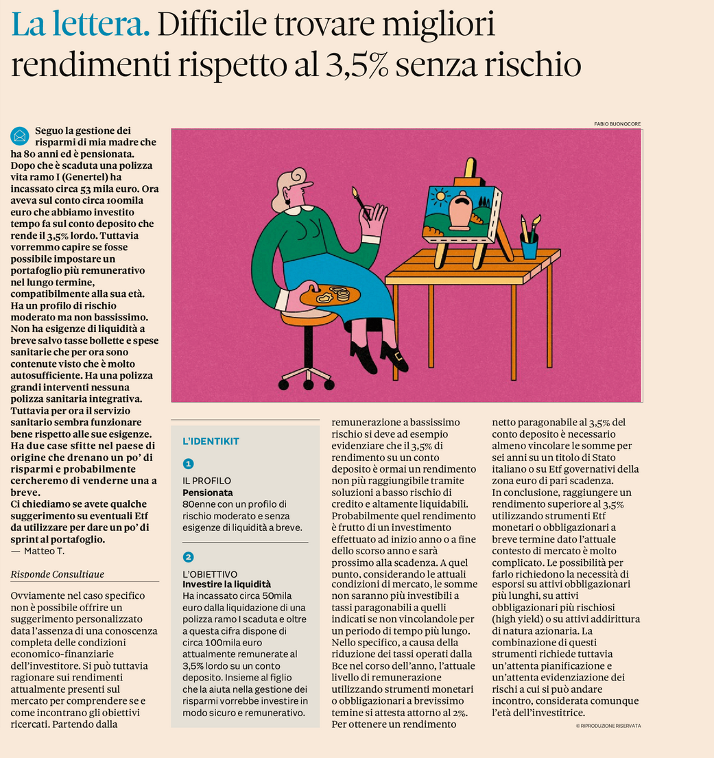 Ovviamente nel caso specifico non è possibile offrire un suggerimento personalizzato data l’assenza di una conoscenza completa delle condizioni economico-finanziarie dell’investitore. Si può tuttavia ragionare sui rendimenti attualmente presenti sul mercato per comprendere se e come incontrano gli obiettivi ricercati. Partendo dalla remunerazione a bassissimo rischio si deve ad esempio evidenziare che il 3,5% di rendimento su un conto deposito è ormai un rendimento non più raggiungibile tramite soluzioni a basso rischio di credito e altamente liquidabili. Probabilmente quel rendimento è frutto di un investimento effettuato ad inizio anno o a fine dello scorso anno e sarà prossimo alla scadenza. A quel punto, considerando le attuali condizioni di mercato, le somme non saranno più investibili a tassi paragonabili a quelli indicati se non vincolandole per un periodo di tempo più lungo. Nello specifico, a causa della riduzione dei tassi operati dalla Bce nel corso dell’anno, l’attuale livello di remunerazione utilizzando strumenti monetari o obbligazionari a brevissimo temine si attesta attorno al 2%. Per ottenere un rendimento netto paragonabile al 3,5% del conto deposito è necessario almeno vincolare le somme per sei anni su un titolo di Stato italiano o su Etf governativi della zona euro di pari scadenza.