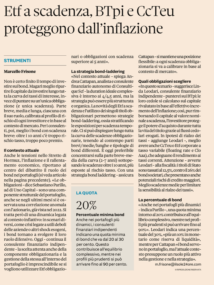 Anche le tensioni nello Stretto di Hormuz, l’inflazione e il rallentamento economico, riportano al centro del dibattito il ruolo dei bond nei portafogli (si veda articolo nella pagina precedente). «Le obbligazioni - dice Sebastiano Parillo, ad di Uno Capital - sono una componente strutturale del portafoglio, anche se negli ultimi mesi si è osservata una correlazione anomala con l’azionario, già vista nel 2022. Si tratta però di una dinamica legata al contesto inflattivo: in scenari diversi, come crisi legate a utili deboli delle aziende o altri shock esogeni, i bond tornano a svolgere il loro ruolo difensivo. Oggi - continua il consulente finanziario indipendente - la scelta attenta anche della componente obbligazionaria e la gestione della stessa all’interno del portafoglio è imprescindibile se si vogliono utilizzare Etf obbligazionari o obbligazioni con scadenza superiore ai 5 anni».