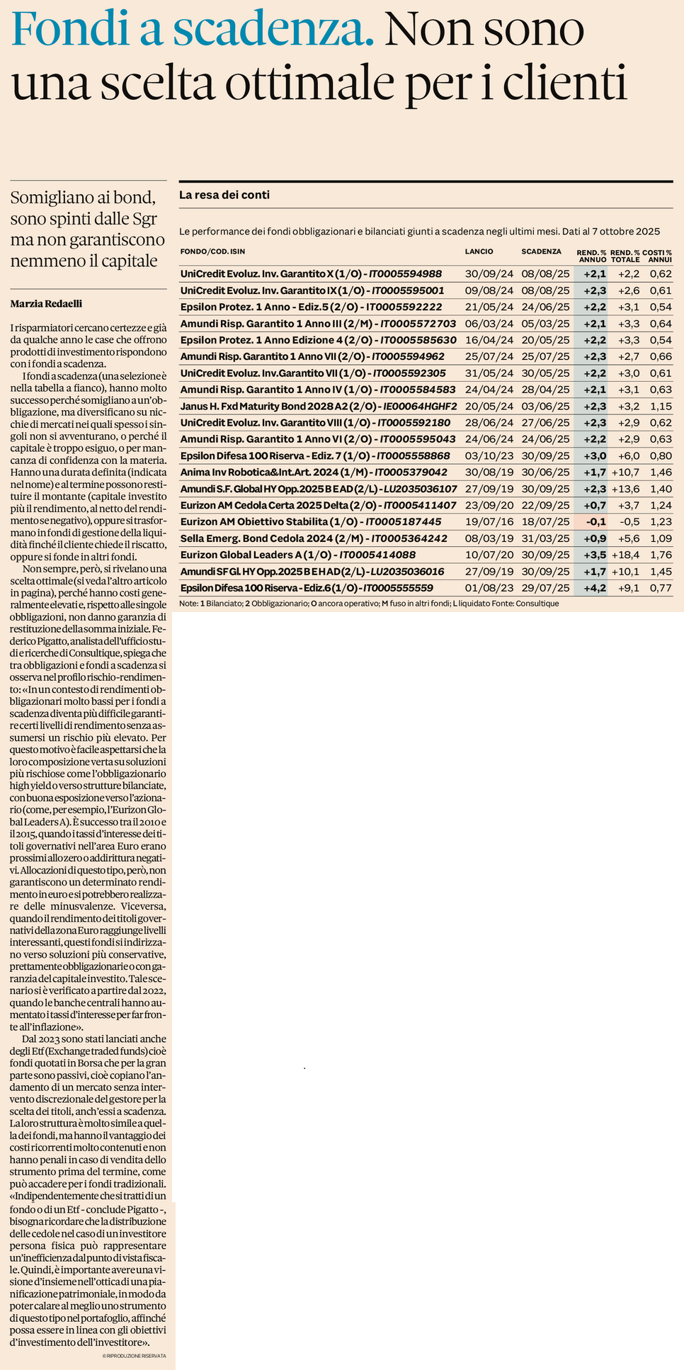 Dal 2023 sono stati lanciati anche degli Etf (Exchange traded funds) cioè fondi quotati in Borsa che per la gran parte sono passivi, cioè copiano l’andamento di un mercato senza intervento discrezionale del gestore per la scelta dei titoli, anch’essi a scadenza. La loro struttura è molto simile a quella dei fondi, ma hanno il vantaggio dei costi ricorrenti molto contenuti e non hanno penali in caso di vendita dello strumento prima del termine, come può accadere per i fondi tradizionali. «Indipendentemente che si tratti di un fondo o di un Etf - conclude Pigatto -, bisogna ricordare che la distribuzione delle cedole nel caso di un investitore persona fisica può rappresentare un’inefficienza dal punto di vista fiscale. Quindi, è importante avere una visione d’insieme nell’ottica di una pianificazione patrimoniale, in modo da poter calare al meglio uno strumento di questo tipo nel portafoglio, affinché possa essere in linea con gli obiettivi d’investimento dell’investitore».