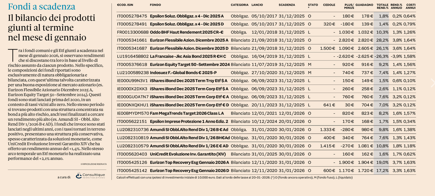 Tra i fondi comuni e gli Etf giunti a scadenza nel mese di gennaio 2026, si osservano rendimenti che si discostano tra loro in base al livello di rischio assunto da ciascun prodotto. Nello specifico, le composizioni dei fondi riportati sono esclusivamente di natura obbligazionaria e bilanciata, con quest’ultima talvolta caratterizzata per una buona esposizione al mercato azionario (es. Eurizon Flessibile Azionario Dicembre 2025 A, Eurizon Equity Target 50 -Settembre 2024). Questi fondi sono stati lanciati prima del 2020, in un contesto di tassi vicini allo zero. Nello stesso periodo si trovano prodotti con una struttura concentrata su bond a più alto rischio, anch’essi finalizzati a cercare un rendimento più alto (es. Amundi SI - Obbl. Alto Rend Div 1/2026 B € AD). I fondi che invece sono stati lanciati negli ultimi anni, con i tassi tornati in terreno positivo, presentano una struttura più conservativa, spesso caratterizzata da soluzioni monetarie, come UniCredit Evoluzione Investi Garantito XIV che ha offerto un rendimento annuo del +1,4%. Nello stesso arco temporale un Etf monetario ha realizzato una performance del +2,1% annuo.