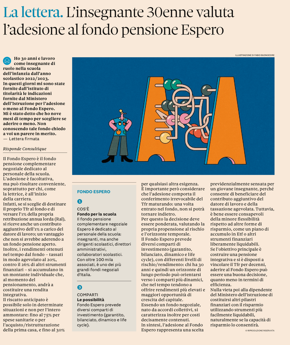 In sintesi, l’adesione al Fondo Espero rappresenta una scelta previdenzialmente sensata per un giovane insegnante, perché consente di beneficiare del contributo aggiuntivo del datore di lavoro e della tassazione agevolata. Tuttavia, è bene essere consapevoli della minore flessibilità rispetto ad altre forme di risparmio, come un piano di accumulo in Etf o altri strumenti finanziari liberamente liquidabili.