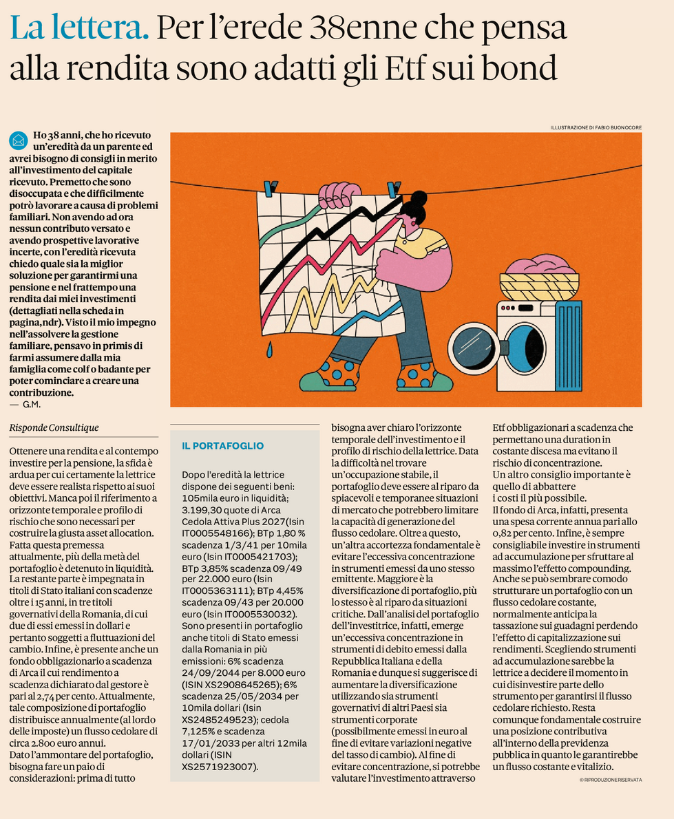Dato l’ammontare del portafoglio, bisogna fare un paio di considerazioni: prima di tutto bisogna aver chiaro l’orizzonte temporale dell’investimento e il profilo di rischio della lettrice. Data la difficoltà nel trovare un’occupazione stabile, il portafoglio deve essere al riparo da spiacevoli e temporanee situazioni di mercato che potrebbero limitare la capacità di generazione del flusso cedolare. Oltre a questo, un’altra accortezza fondamentale è evitare l’eccessiva concentrazione in strumenti emessi da uno stesso emittente. Maggiore è la diversificazione di portafoglio, più lo stesso è al riparo da situazioni critiche. Dall’analisi del portafoglio dell’investitrice, infatti, emerge un’eccessiva concentrazione in strumenti di debito emessi dalla Repubblica Italiana e della Romania e dunque si suggerisce di aumentare la diversificazione utilizzando sia strumenti governativi di altri Paesi sia strumenti corporate (possibilmente emessi in euro al fine di evitare variazioni negative del tasso di cambio). Al fine di evitare concentrazione, si potrebbe valutare l’investimento attraverso Etf obbligazionari a scadenza che permettano una duration in costante discesa ma evitano il rischio di concentrazione.