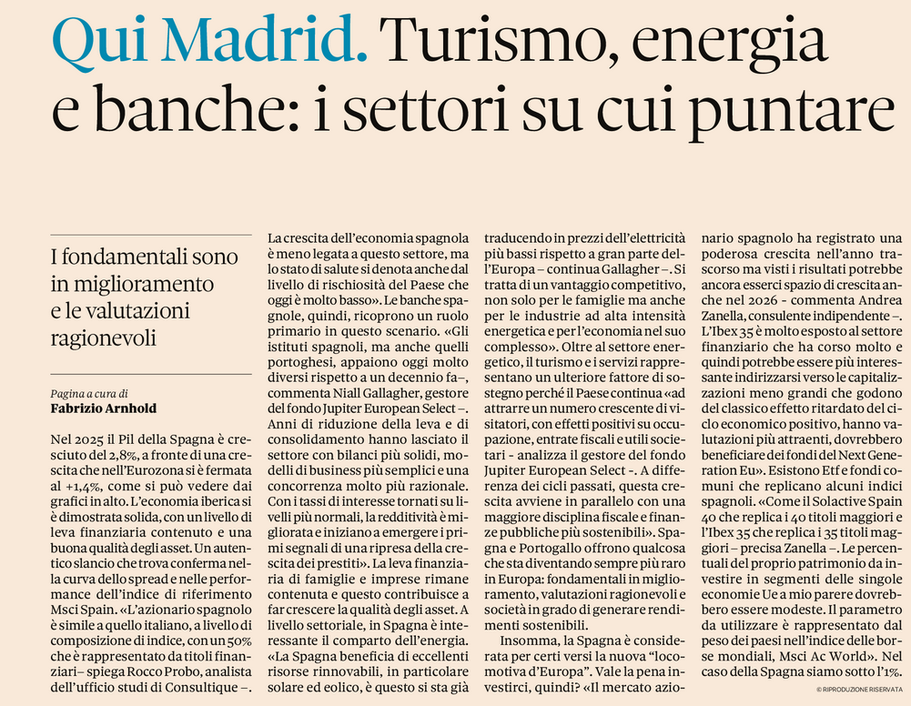 Insomma, la Spagna è considerata per certi versi la nuova “locomotiva d’Europa”. Vale la pena investirci, quindi? «Il mercato azionario spagnolo ha registrato una poderosa crescita nell’anno trascorso ma visti i risultati potrebbe ancora esserci spazio di crescita anche nel 2026 - commenta Andrea Zanella, consulente indipendente –. L’Ibex 35 è molto esposto al settore finanziario che ha corso molto e quindi potrebbe essere più interessante indirizzarsi verso le capitalizzazioni meno grandi che godono del classico effetto ritardato del ciclo economico positivo, hanno valutazioni più attraenti, dovrebbero beneficiare dei fondi del Next Generation Eu». Esistono Etf e fondi comuni che replicano alcuni indici spagnoli. «Come il Solactive Spain 40 che replica i 40 titoli maggiori e l’Ibex 35 che replica i 35 titoli maggiori – precisa Zanella –. Le percentuali del proprio patrimonio da investire in segmenti delle singole economie Ue a mio parere dovrebbero essere modeste. Il parametro da utilizzare è rappresentato dal peso dei paesi nell’indice delle borse mondiali, Msci Ac World». Nel caso della Spagna siamo sotto l’1%.