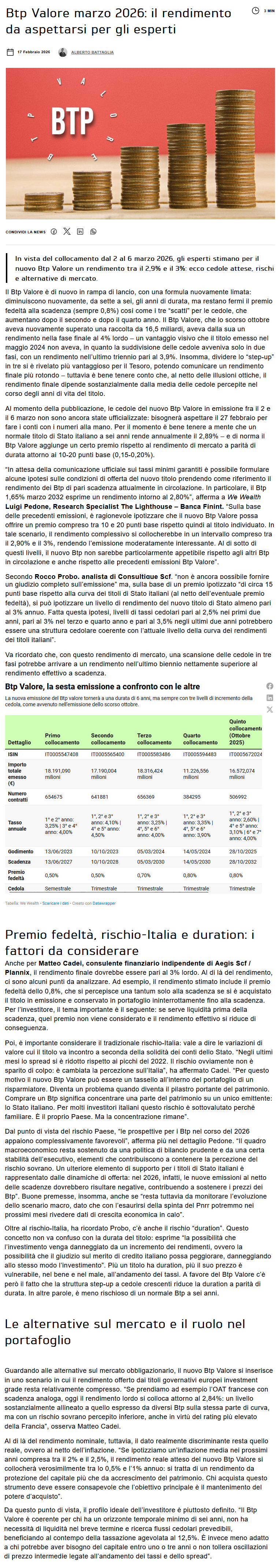 Da questo punto di vista, il profilo ideale dell’investitore è piuttosto definito. “Il Btp Valore è coerente per chi ha un orizzonte temporale minimo di sei anni, non ha necessità di liquidità nel breve termine e ricerca flussi cedolari prevedibili, beneficiando al contempo della tassazione agevolata al 12,5%. È invece meno adatto a chi potrebbe aver bisogno del capitale entro uno o tre anni o non tollera oscillazioni di prezzo intermedie legate all’andamento dei tassi e dello spread”.